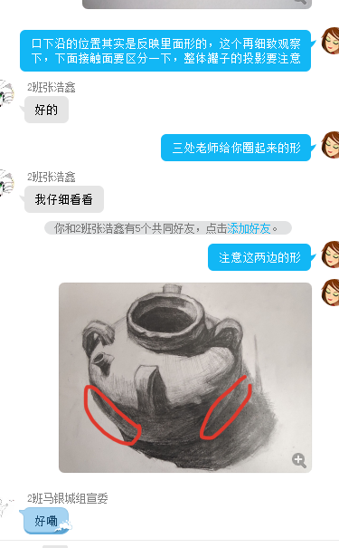 本课程每8至12学时,会产生一个周期作业。同学们每完成一个周期作业,都会由学委统一收齐,发给两位老师。对于周期作业,老师们会用更长的时间进行详细点评,或录制点评视频,或在QQ群利用屏幕分享功能进行直播点评,并要求学生改正画面,直到作业效果让人满意为止。针对个别绘画基础较弱的同学,两位老师会对其进行一对一的单独辅导。无论什么时段,学生遇到问题都可通过微信或QQ直接私信老师,老师们都会在第一时间予以解答。张艳老师虽然身怀六甲,仍经常在QQ群里和同学们就绘画问题聊到很晚,直至问题全部解决才会下线。留学生东布朗因疫情在本国(土库曼斯坦)学习网课,当地网络信号不佳,不能及时听课;了解到该情况后,王美达老师每次都事先提醒该同学按时签到,专门为该生发送课程学习资料。