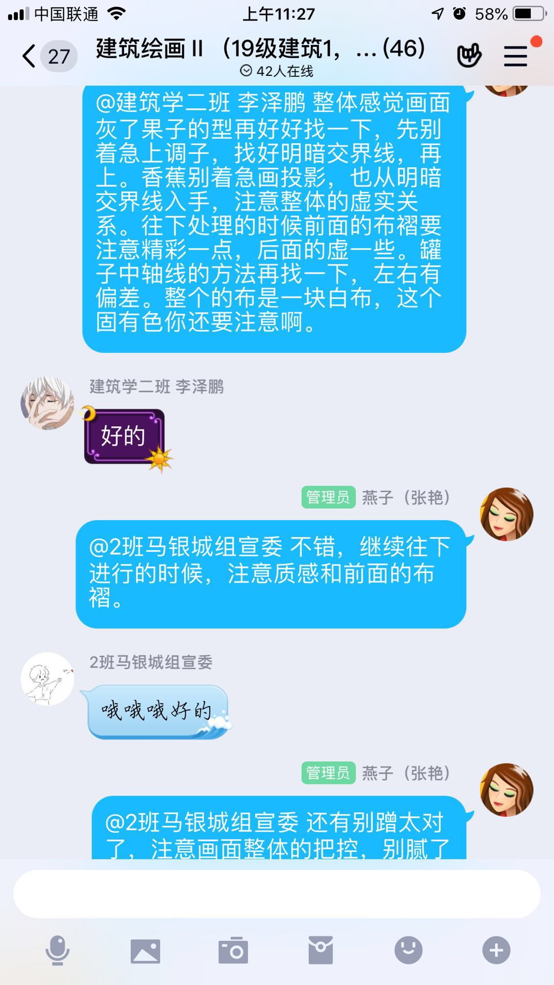 对于绘画类课程而言,及时的点评和辅导,是提高作品质量的关键环节。为保证线上教学的效果,两位老师在点评和辅导上了很大功夫,采取概评与详评相结合的措施。