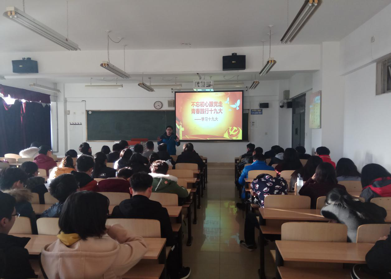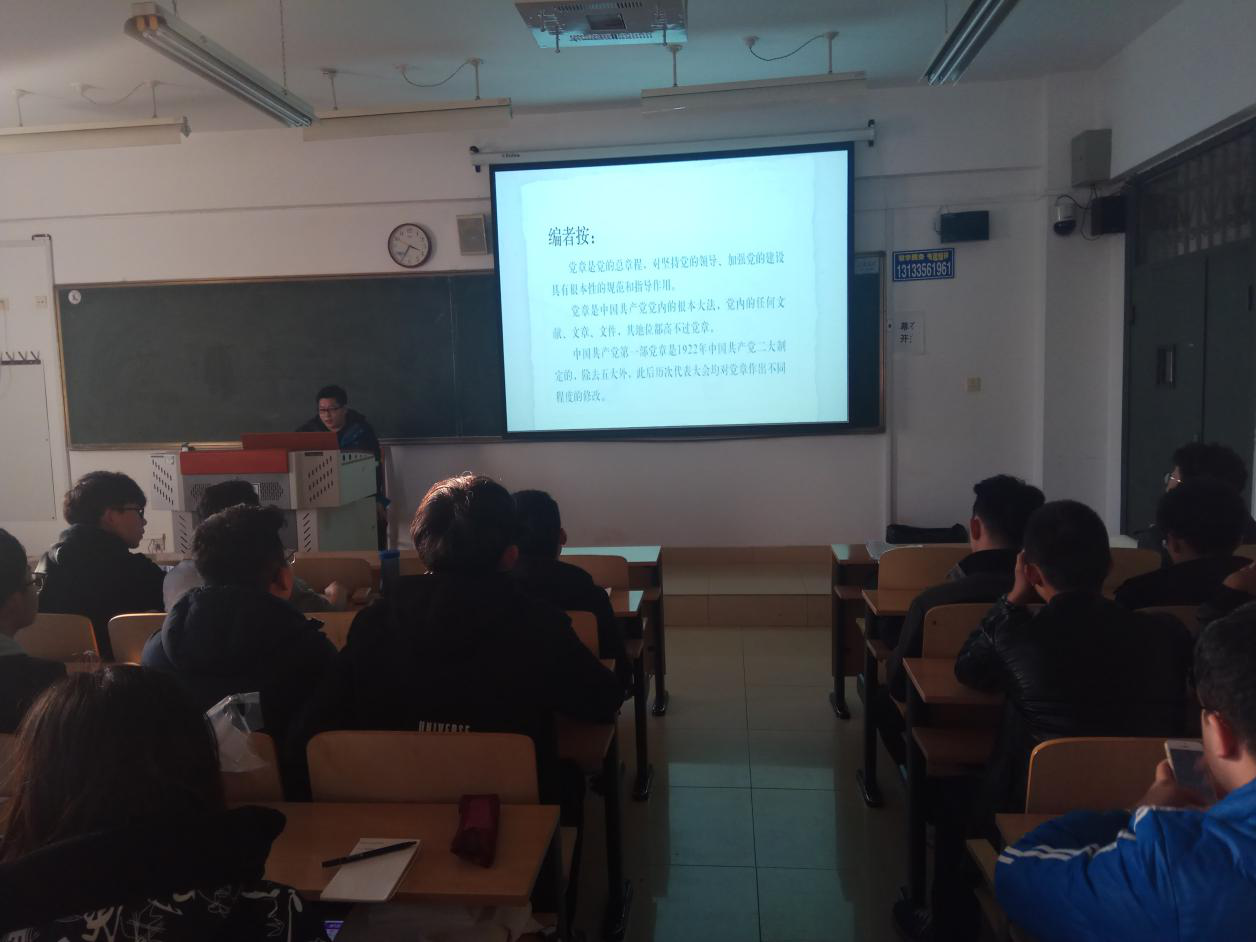 在本次活动中,首先由王凤成老师宣布此次党支部活动的主题,即解读党章。大家先一同观看学习了党的十九大党章公开课视频。视频向大家展示了从中国共产党第一次全国代表大会到中国共产党第十九次全国代表大会中党章的发展和完善过程,让在座的学生对党章的发展变化有了较为明确的认识。之后,王老师通过PPT向大家进一步讲解了从“党的一大”到“党的十九大”不同时期党章内容的具体修改和变化,着重解读了新党章的相关内容,并详细讲解了大学期间学生入党的流程。在这期间,在座的学生认真的记录了新党章的变化和新内容,并且十分积极的回答了王老师关于党章知识的提问。最后,由王老师对本次党支部活动进行总结,宣布本次活动的结束。
