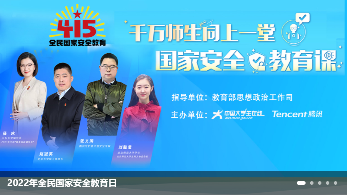 《千万师生同上一堂国家安全教育课》由北京大学保卫部部长赵冠英、腾讯守护者计划安全专家张文涛、2021年全国“最美高校辅导员”山东大学辅导员薛冰,北京师范大学2019级本科生刘懿莹联合为全国师生讲授。