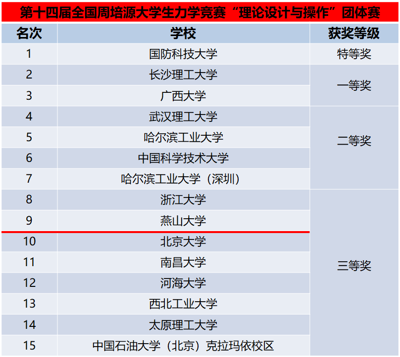近日,第十四届全国周培源大学生力学竞赛落下帷幕。我校在本届竞赛中取得优秀成绩:个人赛获得国家三等奖45项、优秀奖126项,河北赛区特等奖8项、一等奖55项、二等奖77项,河北省前10名我校占5席、前30名我校占18席;我校以河北省综合排名第一的身份首次入围全国团体赛,并在“理论设计与操作”团体赛中获得全国第9名,荣获国家三等奖。梁希、余为、刘小蛮三位教师获得优秀指导教师奖。
