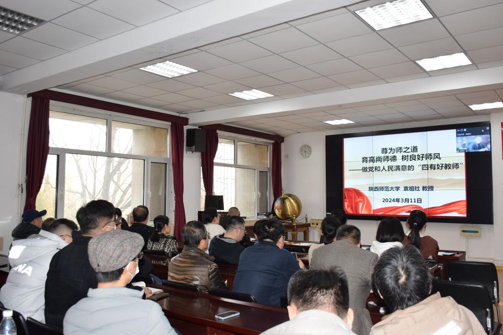 组织师德师风专题培训,集中完成系列培训中的师德师风模块学习,全院教职工共同聆听了陕西师范大学袁祖社教授《尊为师之道 育高尚师德 树良好师风——做党和人民满意的“四有好教师”》的主题报告。