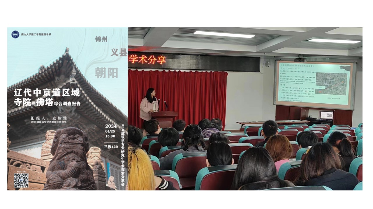 2024年4月25日建筑系第一届建筑学硕士研究生学术探索分享会在第三教学楼420教室召开。分享会面向建筑系全体师生,硕士生代表史陈雅同学做了《辽代中京道区域寺院与佛塔综合调查报告》的分享。