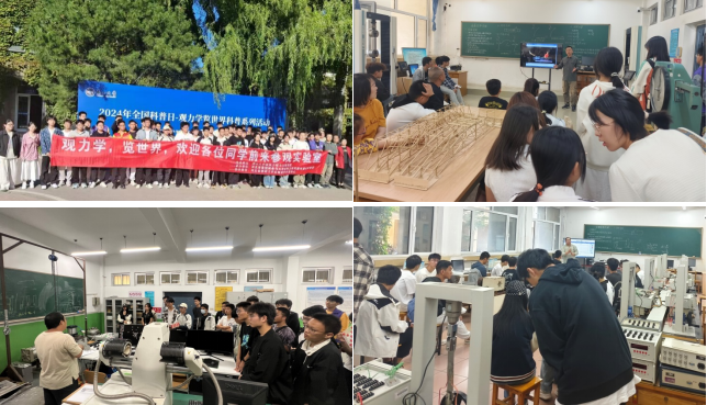 骨干教师、研究生和本科生组成的志愿服务小组在东校区一教各力学实验室,认真向大众普及讲解我国在力学界做出过突出贡献的杰出人物事迹、力学在工程实际、大国重器以及超级工程中的应用、力学先进仪器设备等内容。