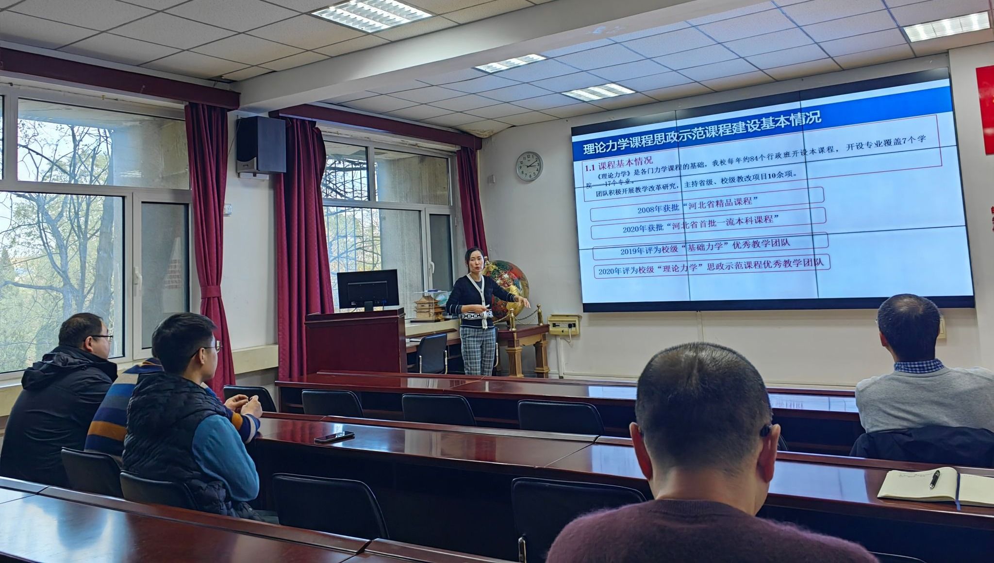 郝颖老师介绍了《理论力学》课程思政示范课程建设的基本情况、建设成果以及后续建设计划,以及力学类专业课的课程思政体系建设的实施情况。基于“课程内容+工程案例+思政元素”三位一体协同发展,提出了《理论力学》课程的研究导向型教学方法。形成了完备的具有力学专业特色的理论讲授、思政教学案例、项目实践相结合的教学课程体系。思政建设成果在全校教师教学培训大会上得到典型示范推广。主讲教师受邀参加由河北省力学学会和河北省高等学校力学教学指导委员会举办的2022年河北省力学课程教学研讨会,并做主题报告。