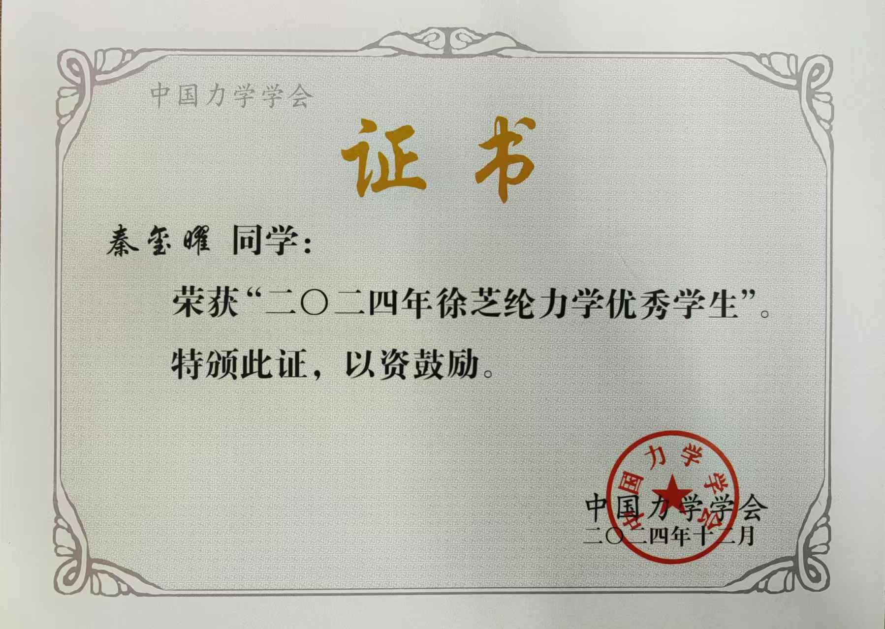 秦玺曜同学荣获“全国徐芝纶力学优秀学生奖”,是无码a片
